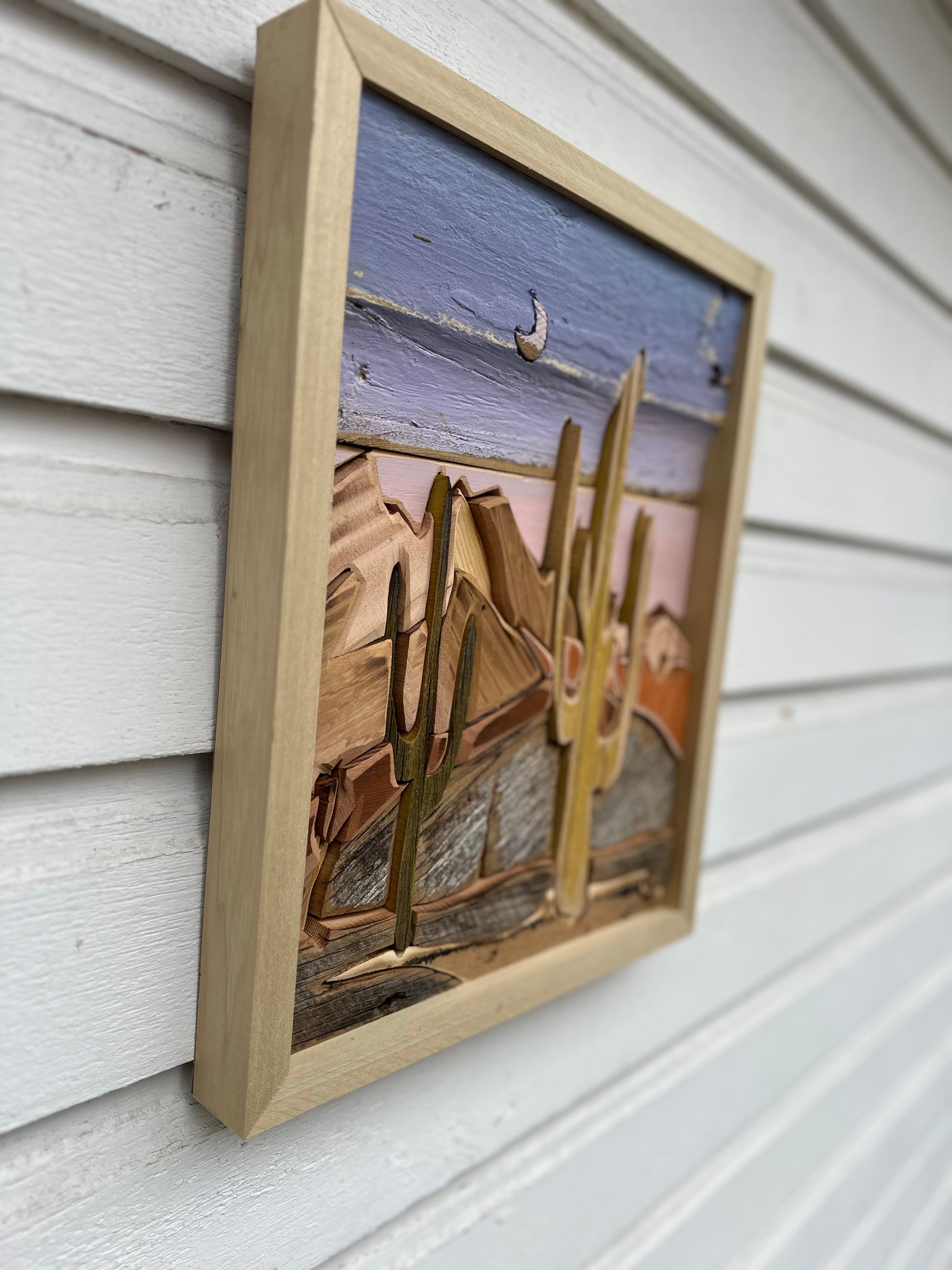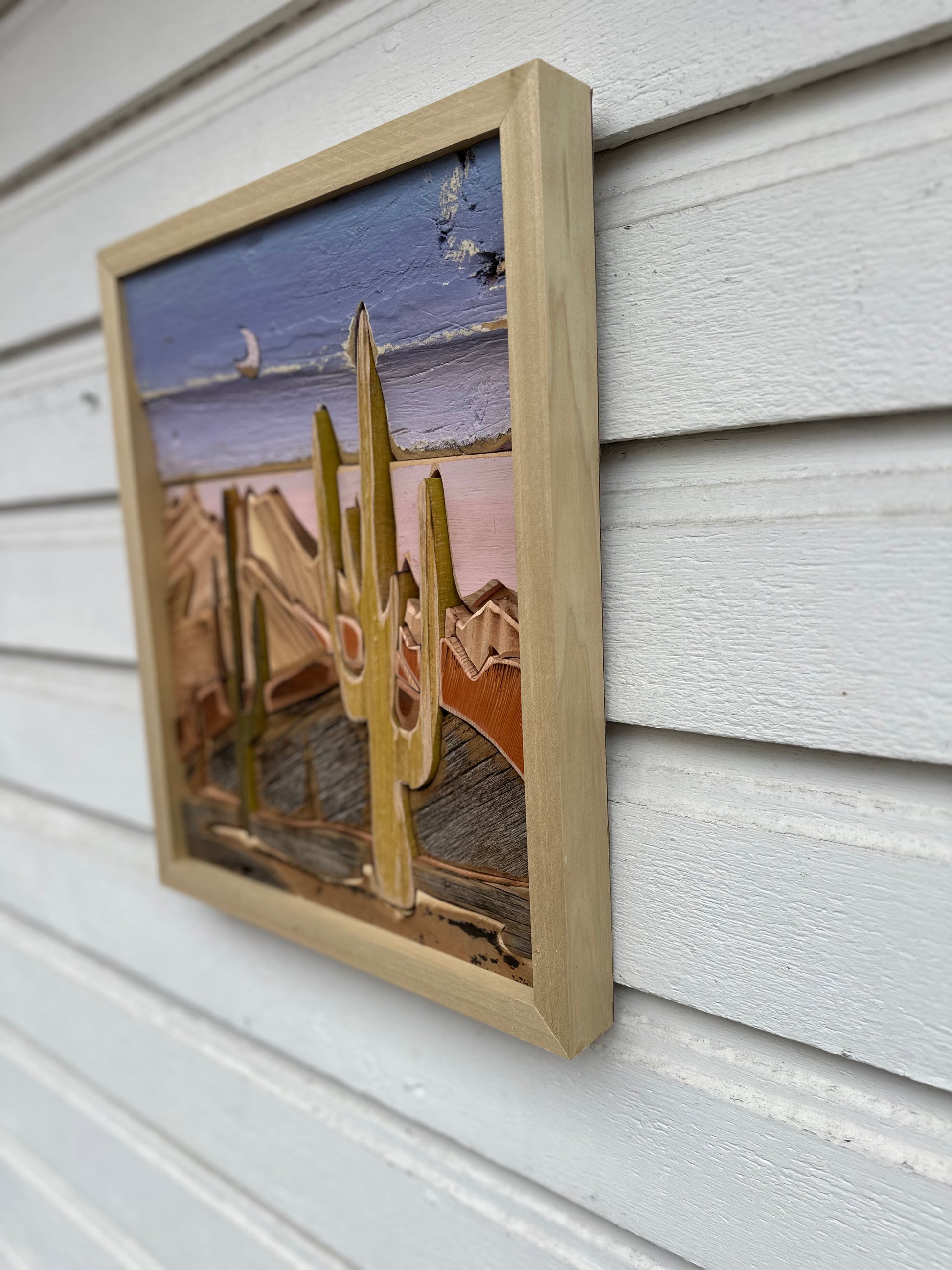 Add a touch of unconventional charm to your home with Desert Sunset. This one-of-a-kind piece, measuring 13 by 17 inches, features a stunning desert sunset on reclaimed wood. Perfect for nature lovers and art enthusiasts alike.